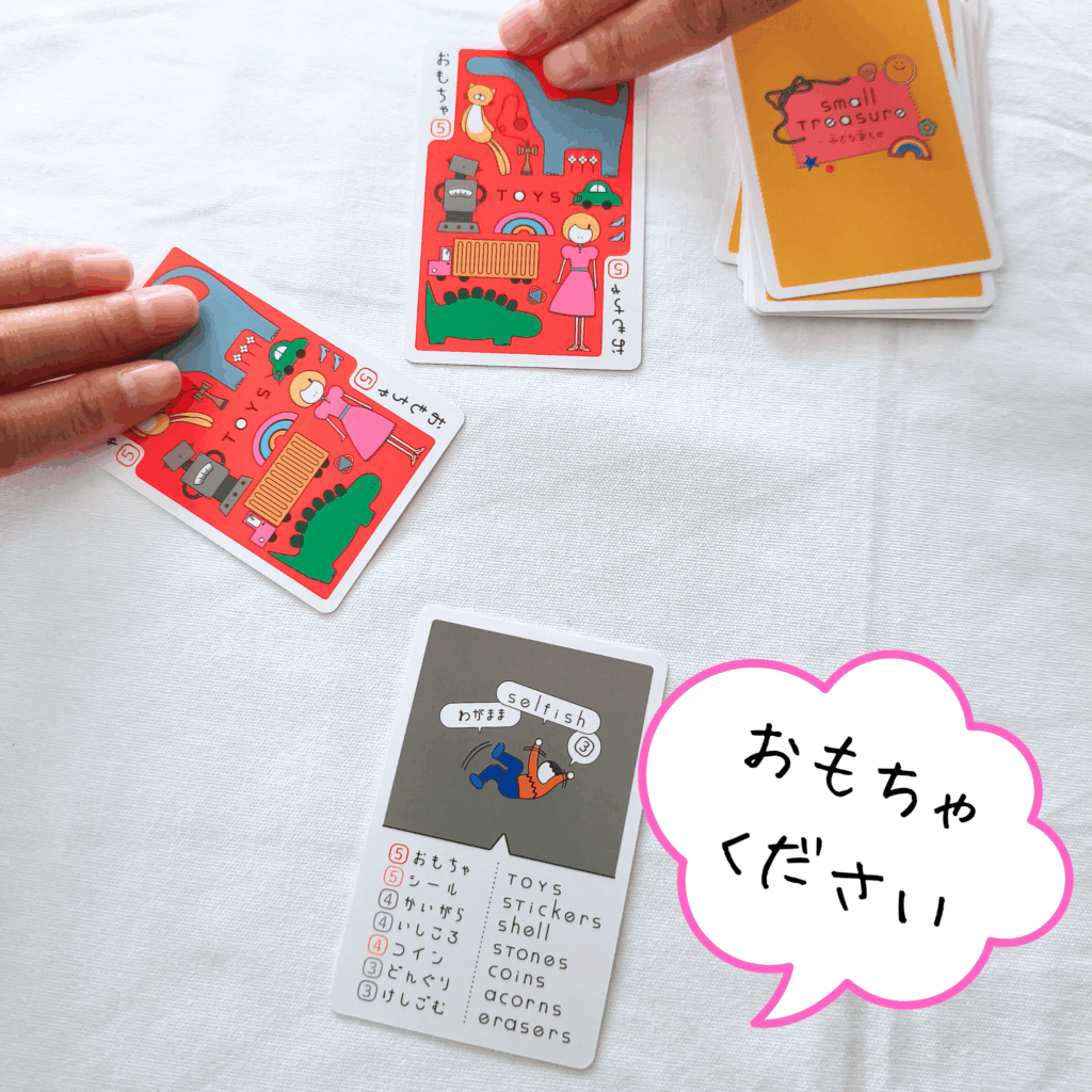 このゲーム、誰が何をおねだりして、持っていたか持っていないかを『しっかり聞いておく』ことがポイント♪おねだりされる宝物は必ず1枚は持っていなければならないので、自分に関係ないターンだったとしても『誰が何をおねだりしたかを把握している』ことで、今後の展開がとっても有利になりそうだと思いました!
