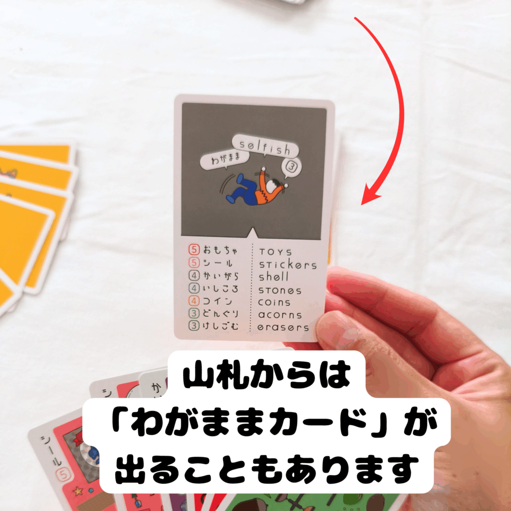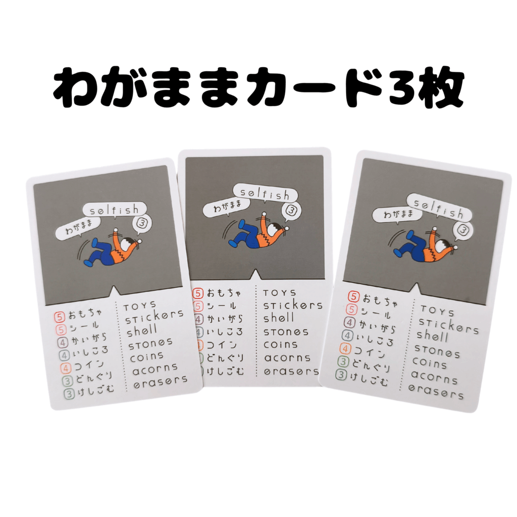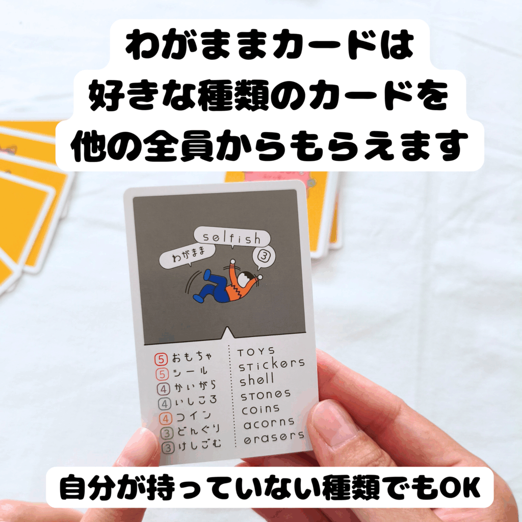 - 山札から「わがままカード」をめくったら、好きな種類のカードを全員からもらうことができる。