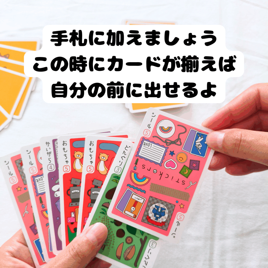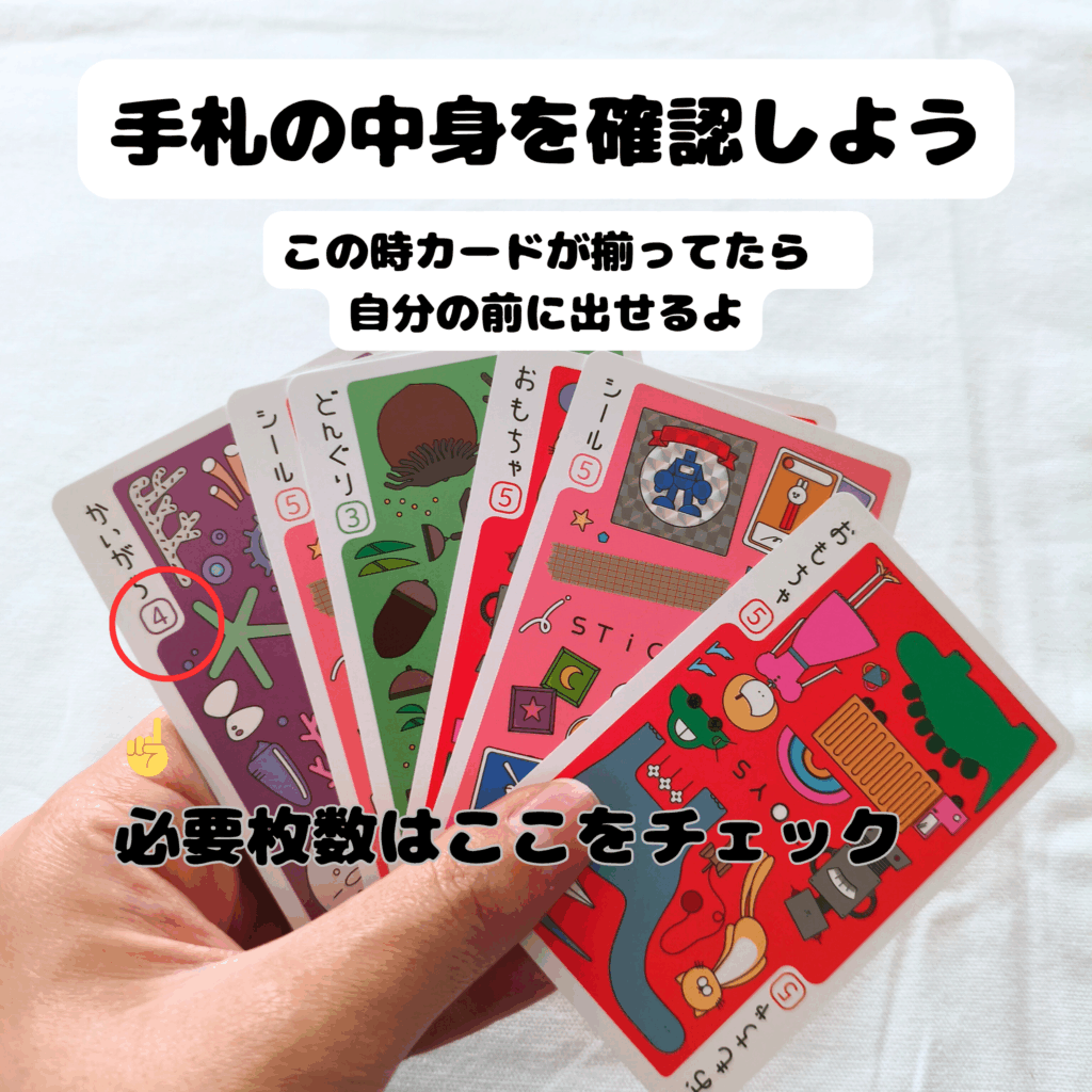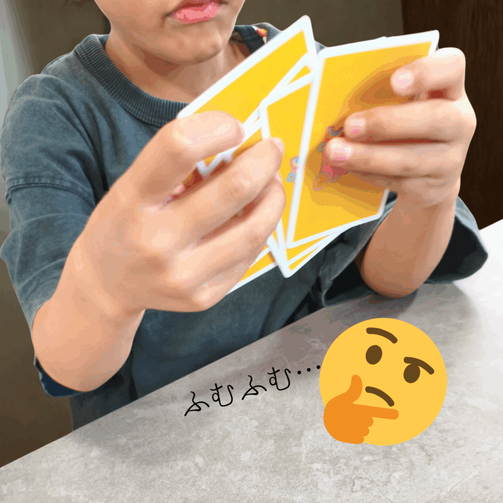 初めて遊ぶ息子も1人で確認しましたが、集める数がカードに書かれているので分かりやすそうでした。昔はカードスタンドを使うことも多かった息子ですが、両手を使って上手に手札を持てていて成長を感じます。