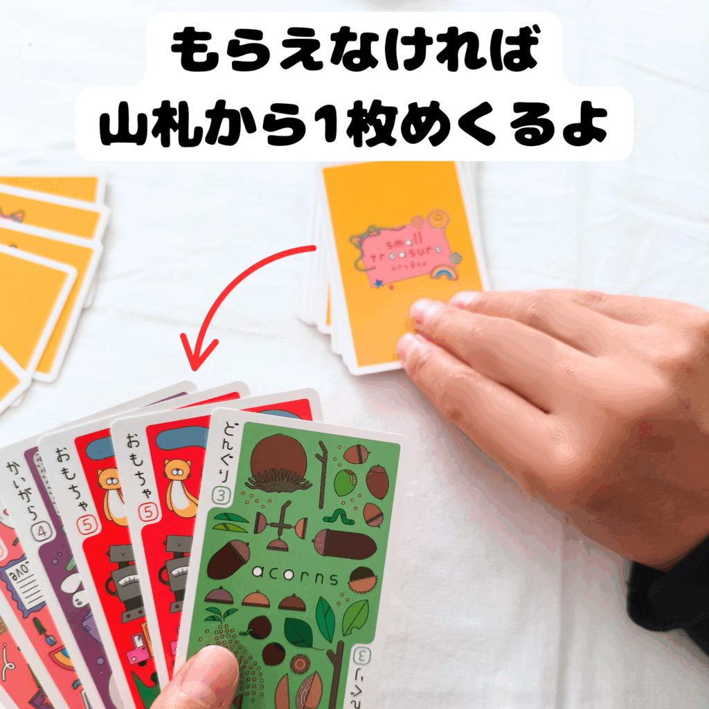 山札からカードを引くために、あえて相手が持っていないものをおねだりするのも作戦ですね!こんなことを考えながら遊べたら策士だな~♪