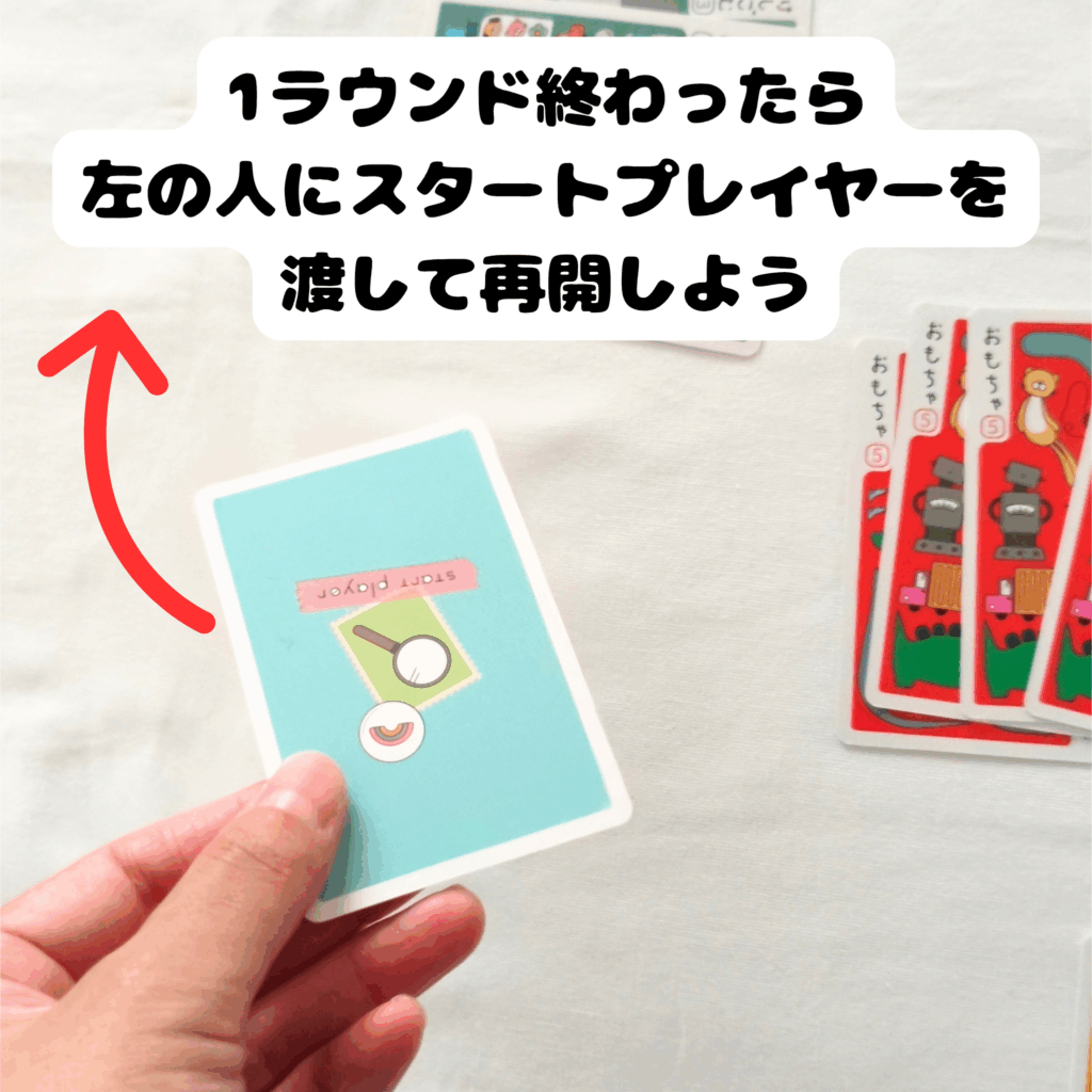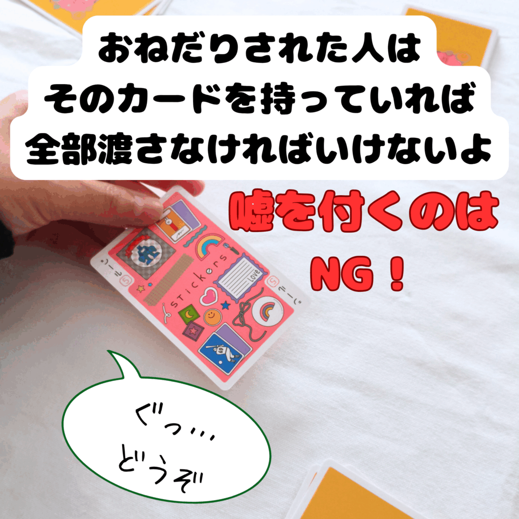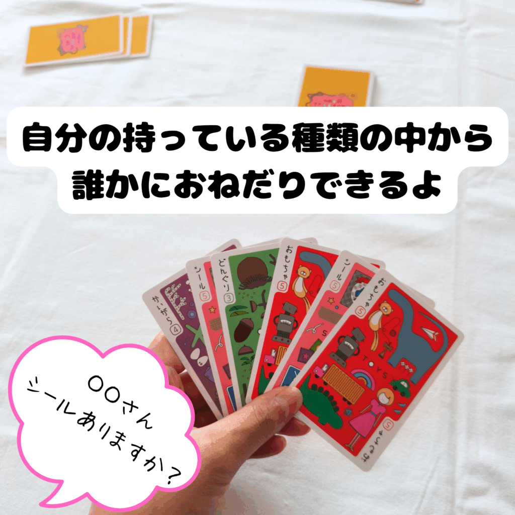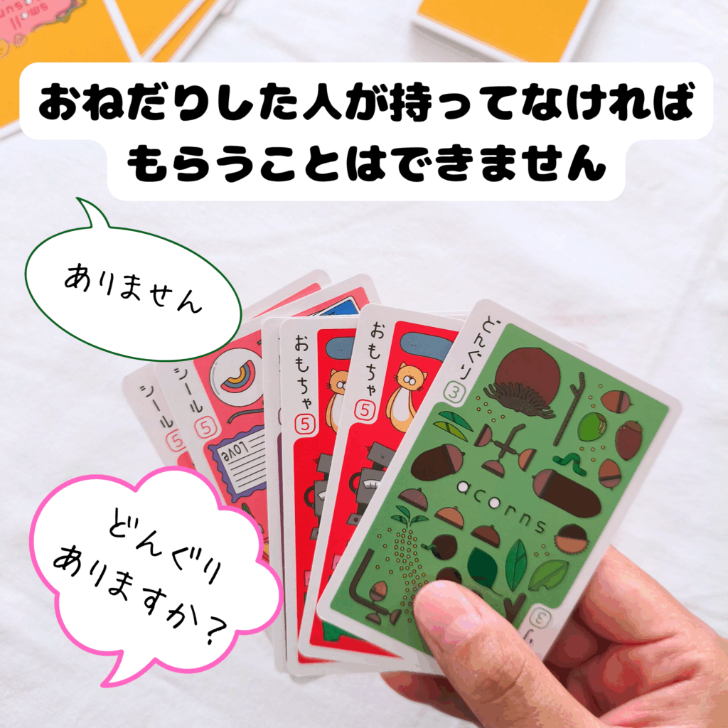 - スタートプレイヤーは誰か1人を指名して、自分の欲しいカードを1種類要求(おねだり)することができる。※誰にでも要求できる。