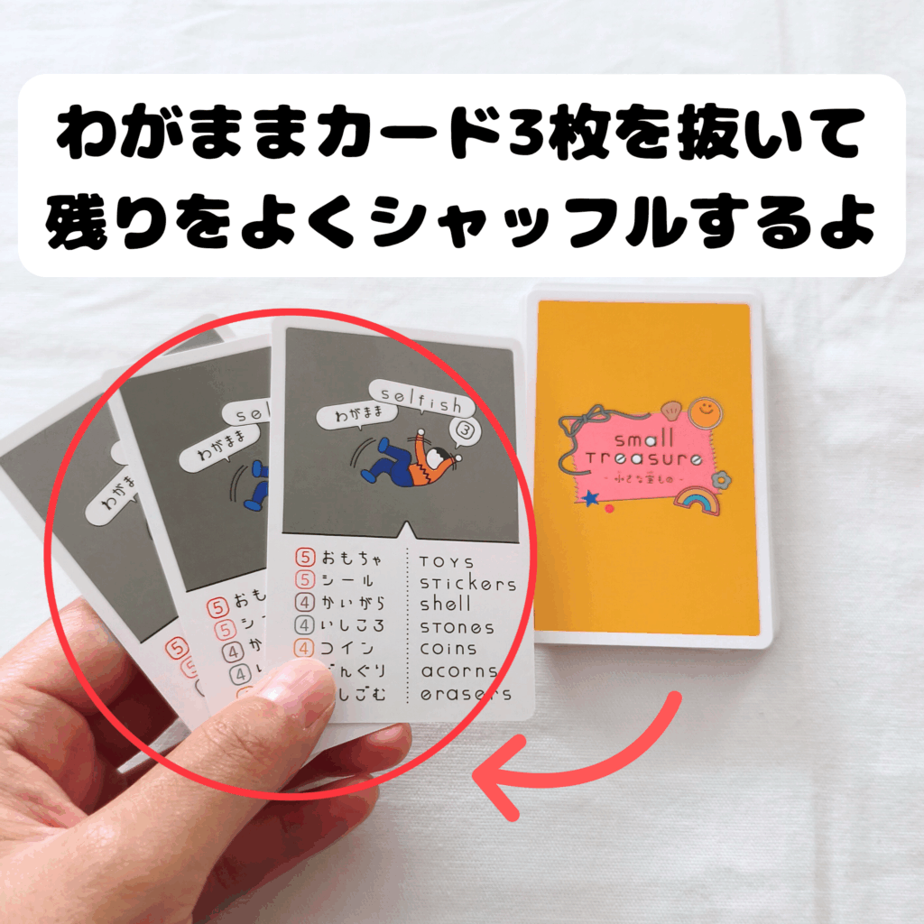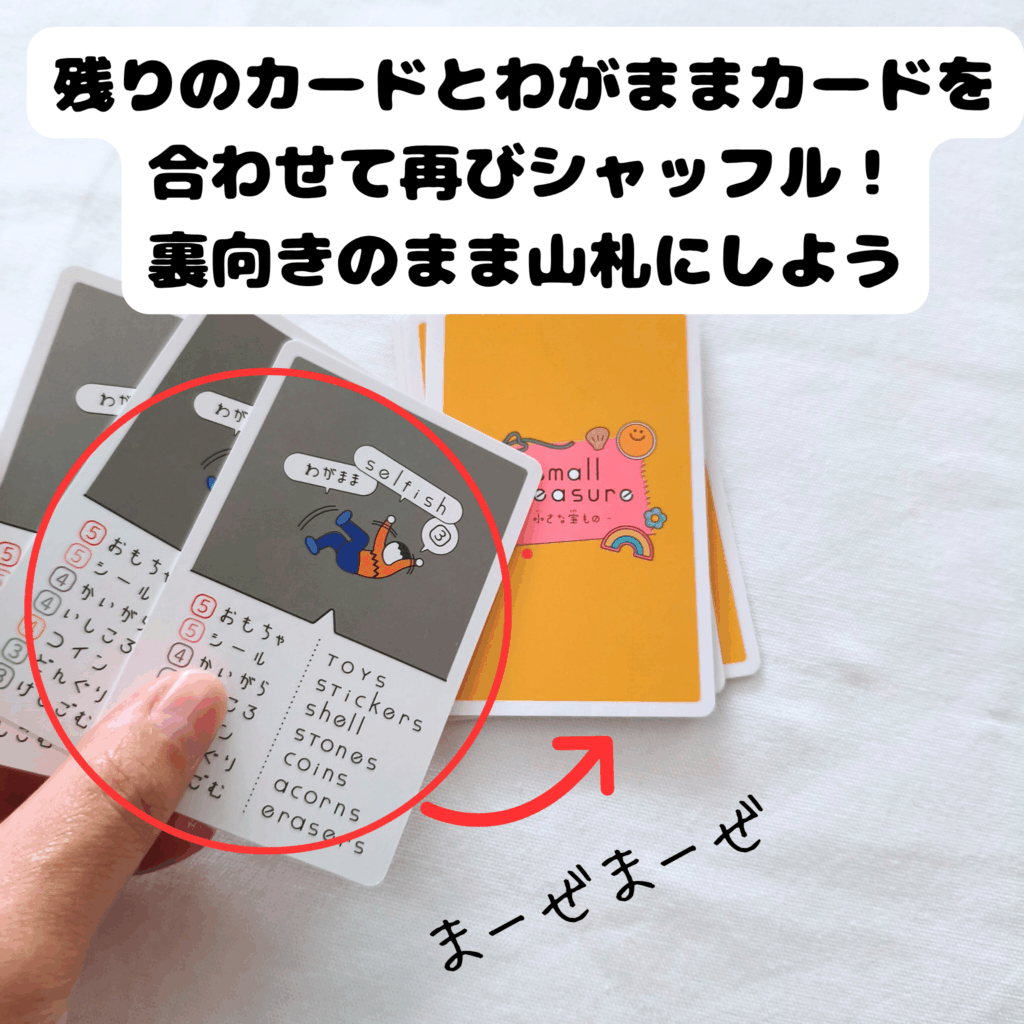 - わがままカード3枚を抜いた全てのカードを、裏向きのままよく混ぜる。