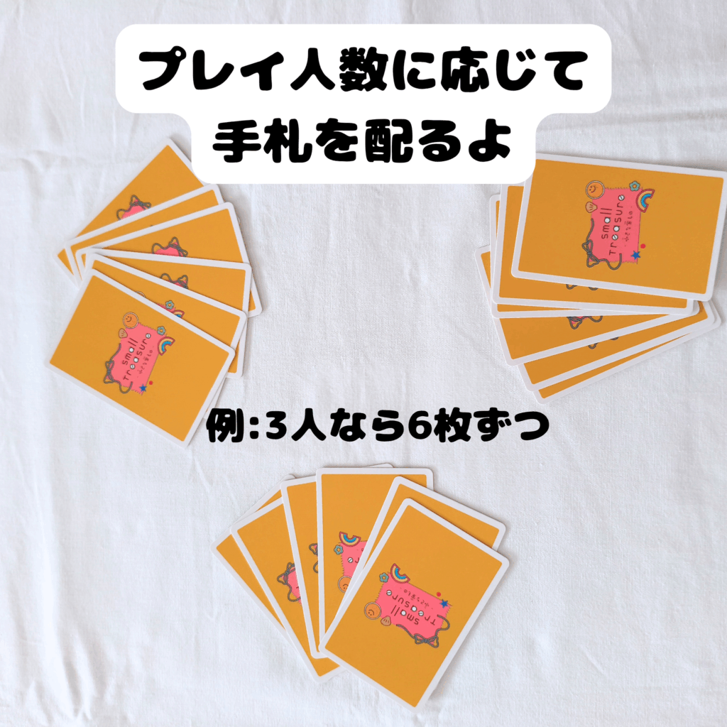 - 各プレイヤーにカードを配る。プレイヤー人数によって枚数が違う。