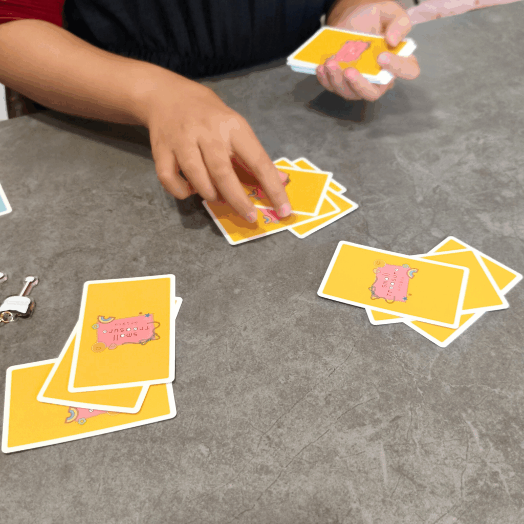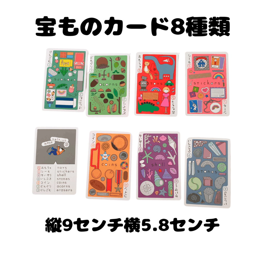 - 配られた中で、すでに宝物が揃っている場合は表向きにして自分の前に出すことができる。