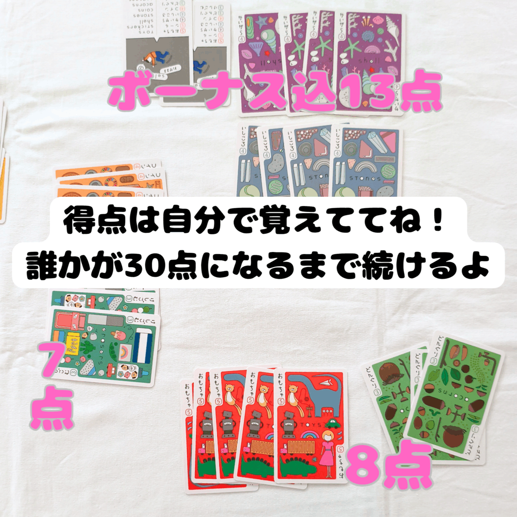 - 誰かが30点に達した時点でゲーム終了。最も得点の高い人の勝ち。