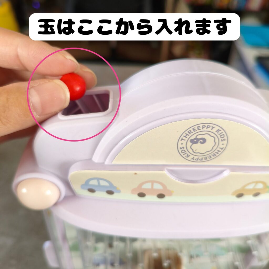 こうなると、片手でボールを入れながらもう片方の手でハンドルを操作しなければなりません。ボールを1つずつ入れればいいのですが、一気にたくさんのボールを落としたい息子には難しそう~!
