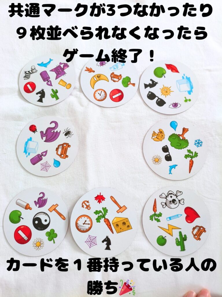 • 並べているカードが8枚以下、または3枚に共通するマークがなくなったらゲーム終了。
