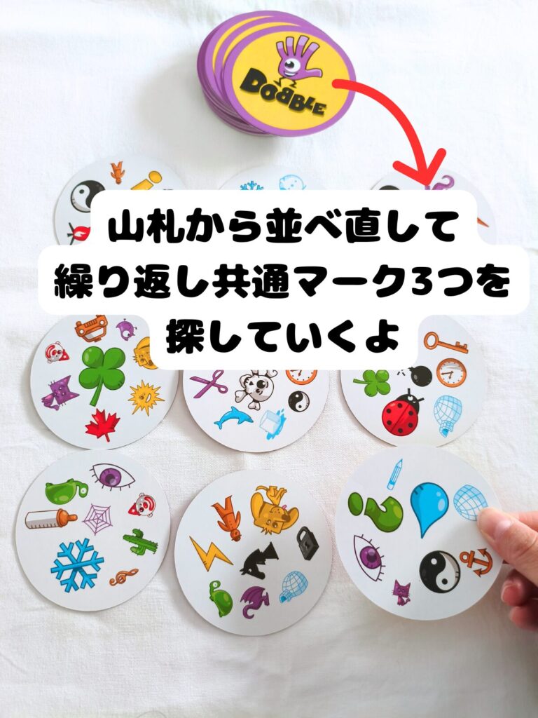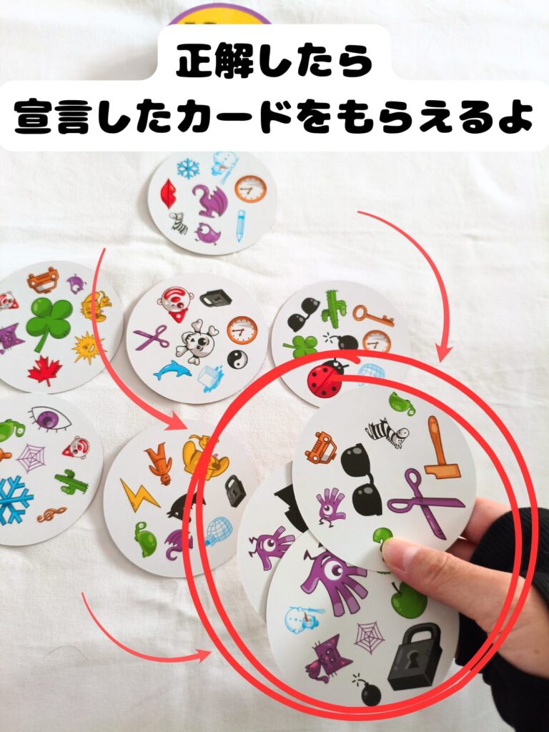 • 全員同時に、表向きに並んだカードの中から3枚に共通するマークを見つけて宣言する。