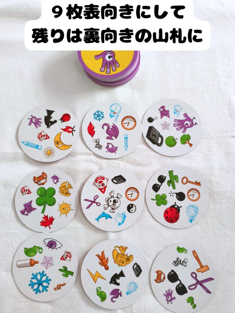 • 上から9枚めくり、場に表向きに並べる。