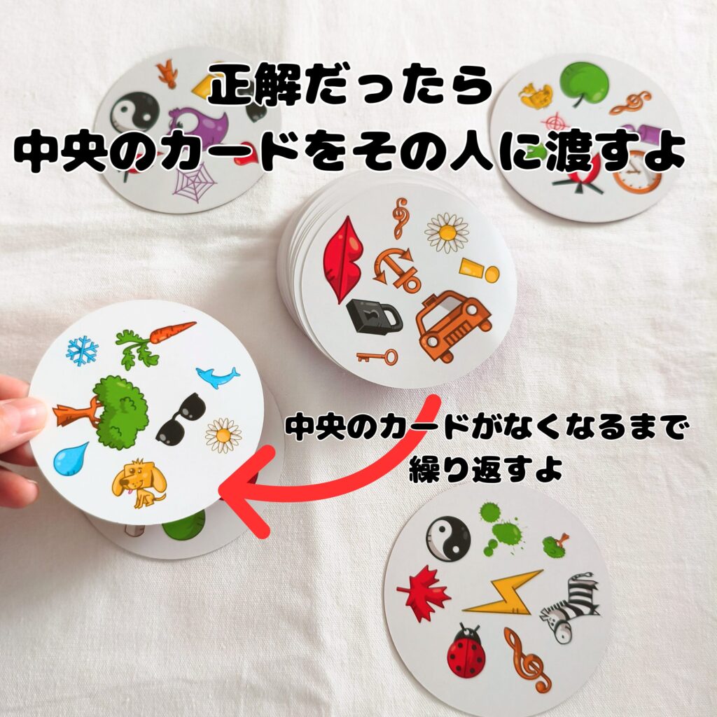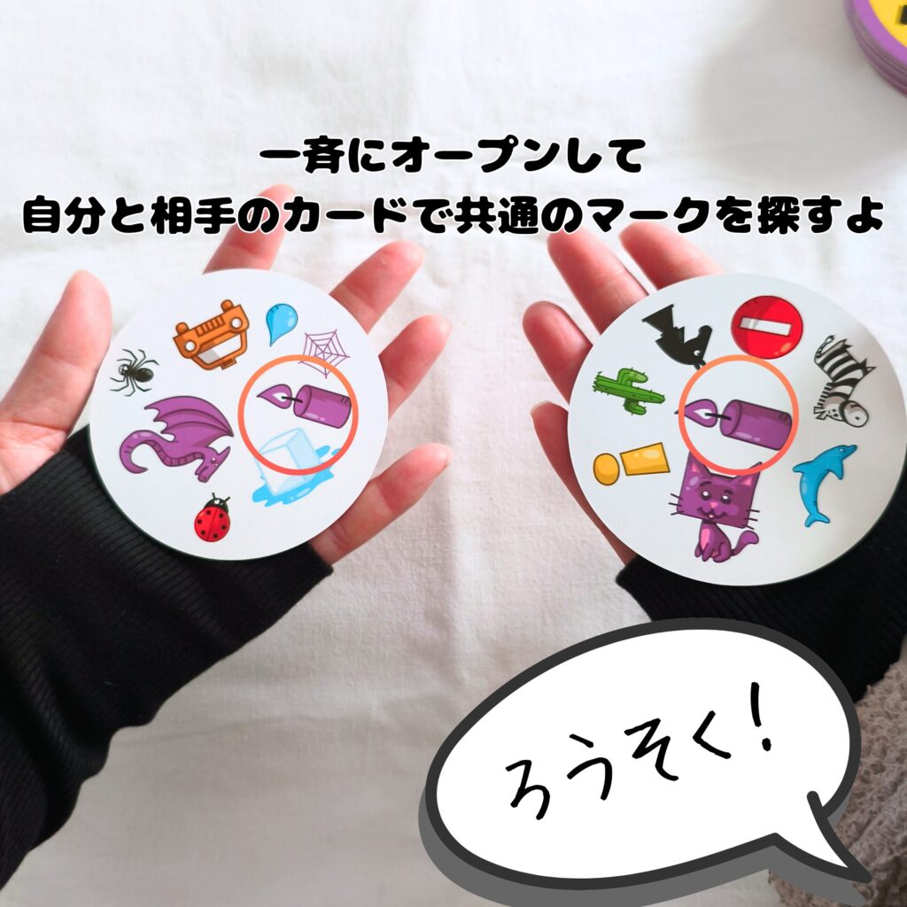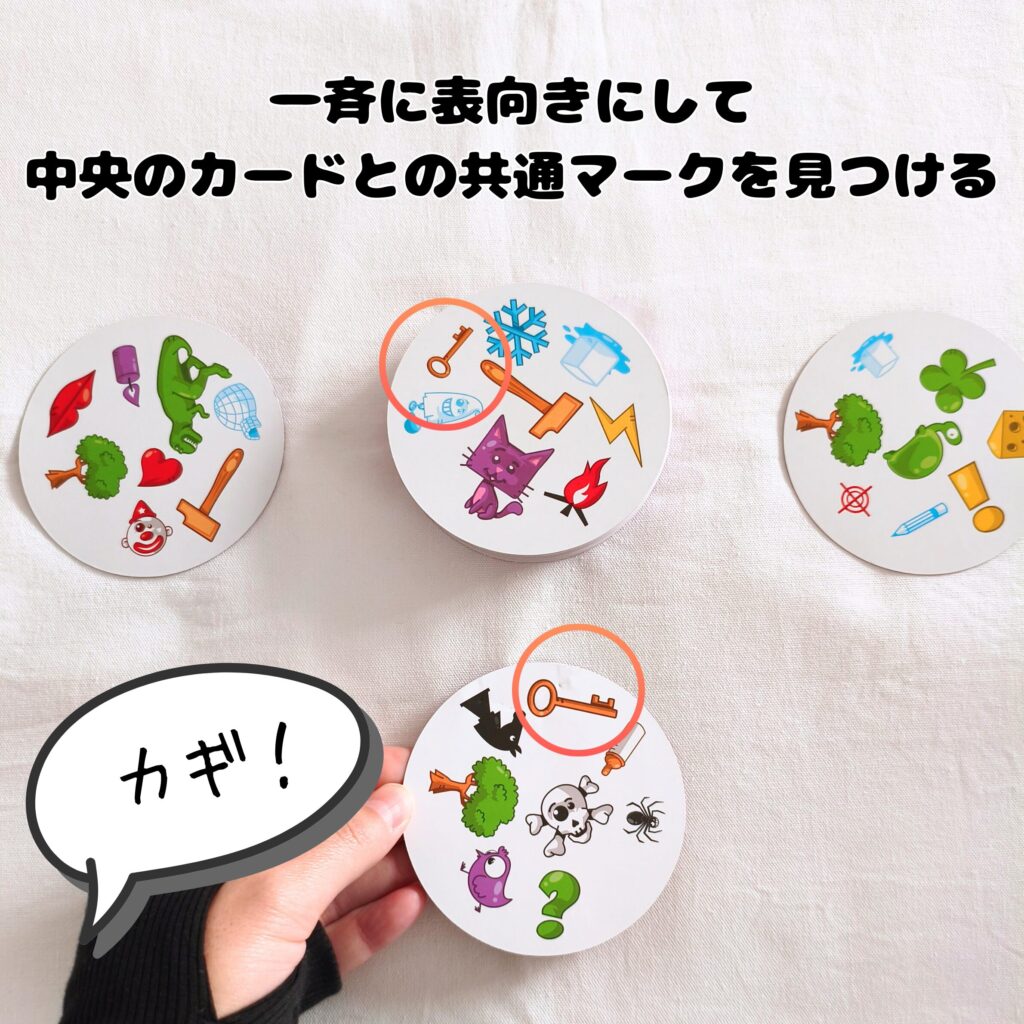• 全員一斉にカードを表向きにして、中央のカードと手札のカードを見比べて同じマークを探す。