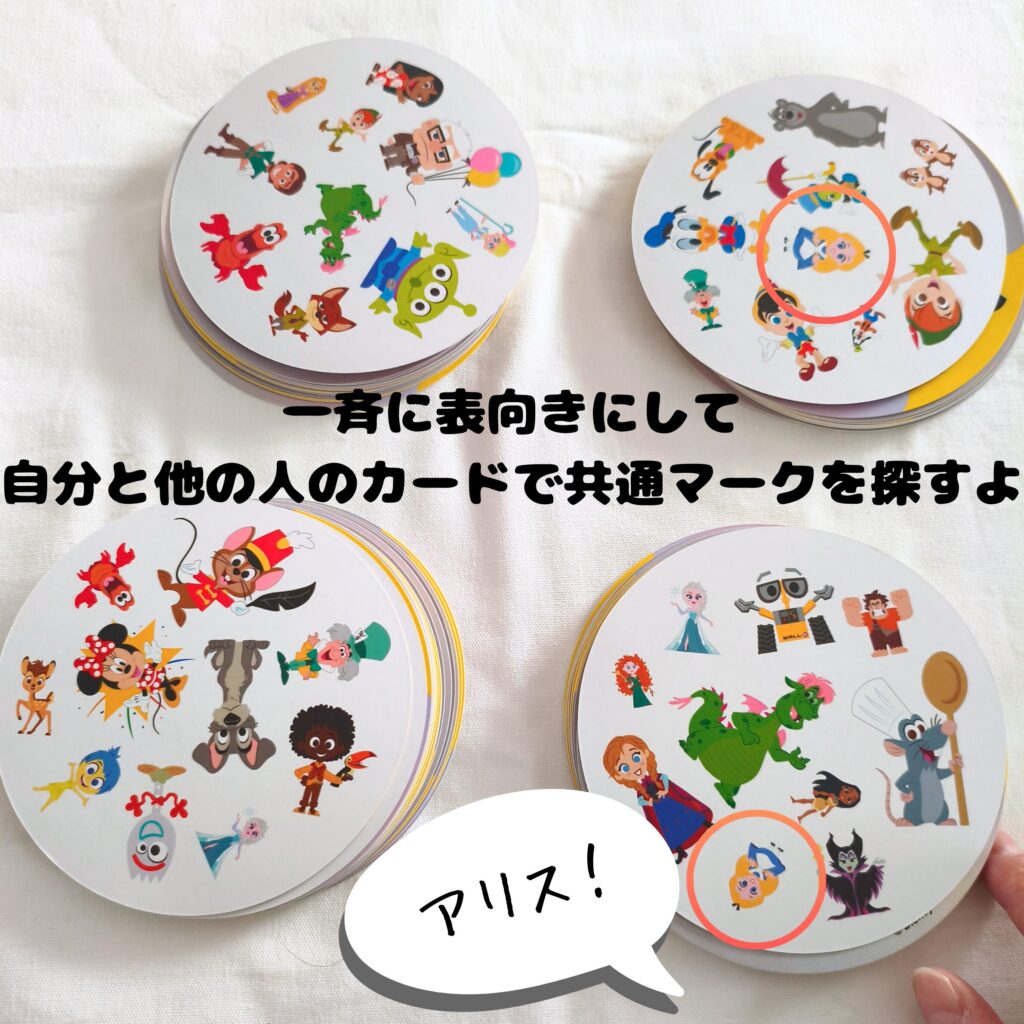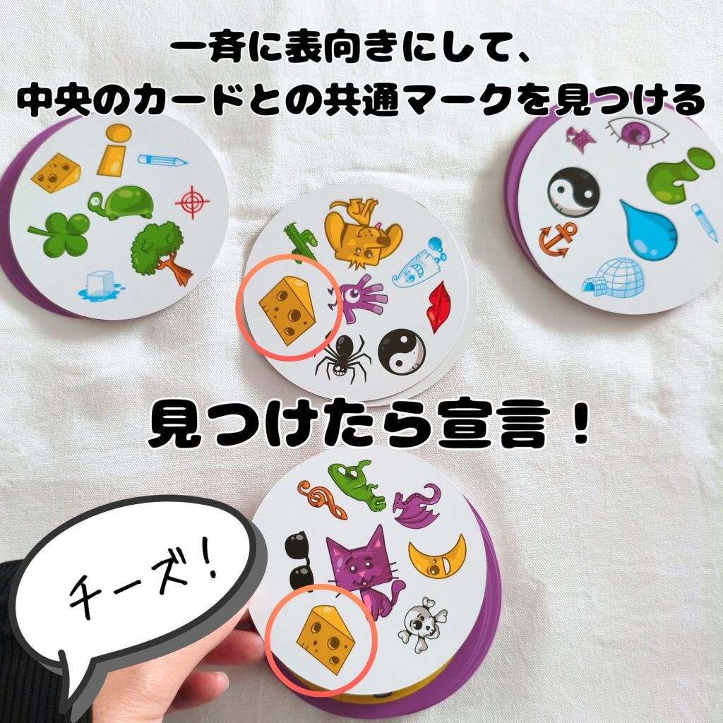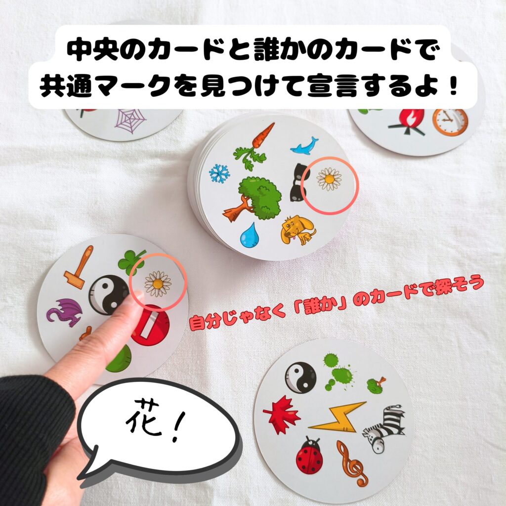 • 全員一斉にカードを表向きにして、中央のカードと手札のカードを見比べて同じマークを探す。