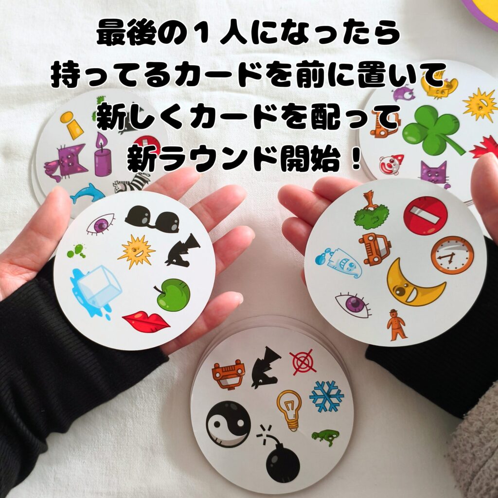 • 決めたラウンド数繰り返し、最後に自分の前に置いたカード枚数が1番少ない人の勝ち。