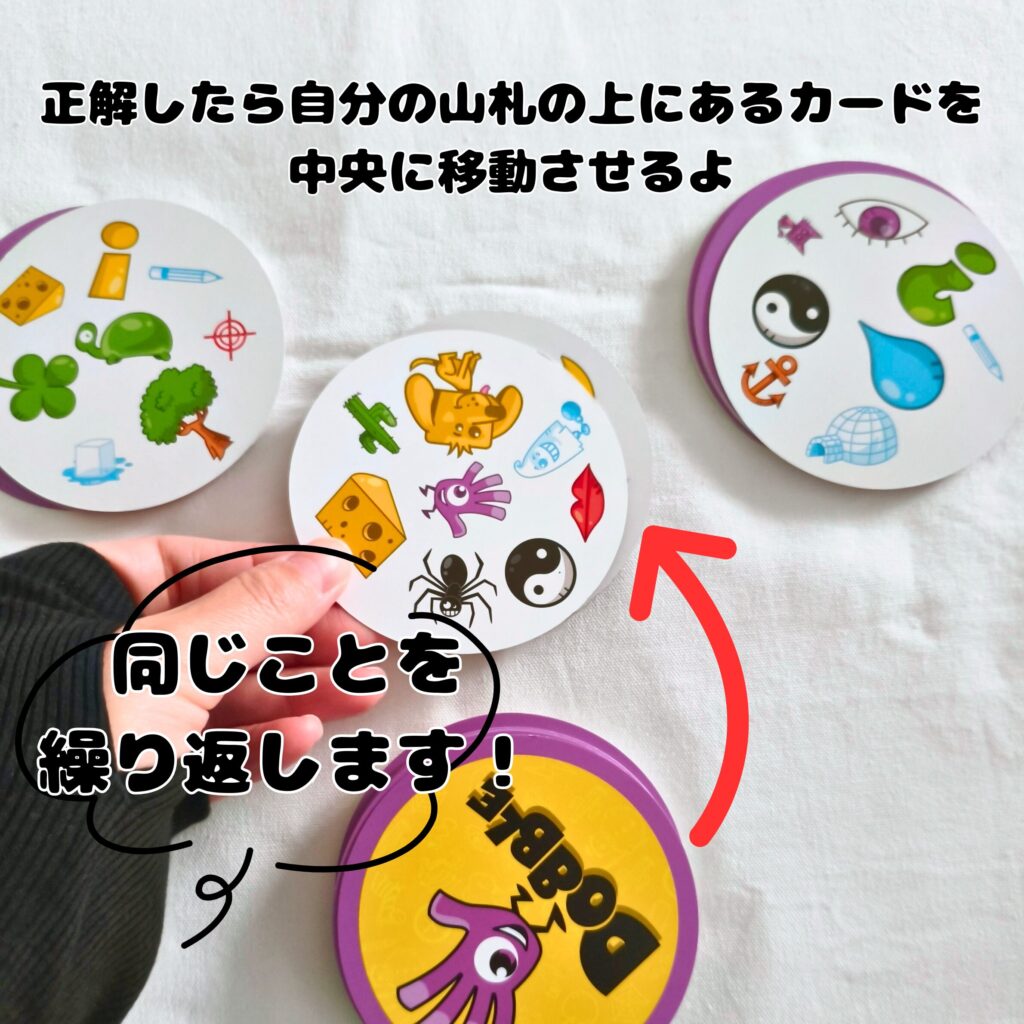 • 同じマークを見つけて先に宣言できた人が、自分の山札の1番上のカードをテーブル中央に移し、同じように繰り返す。