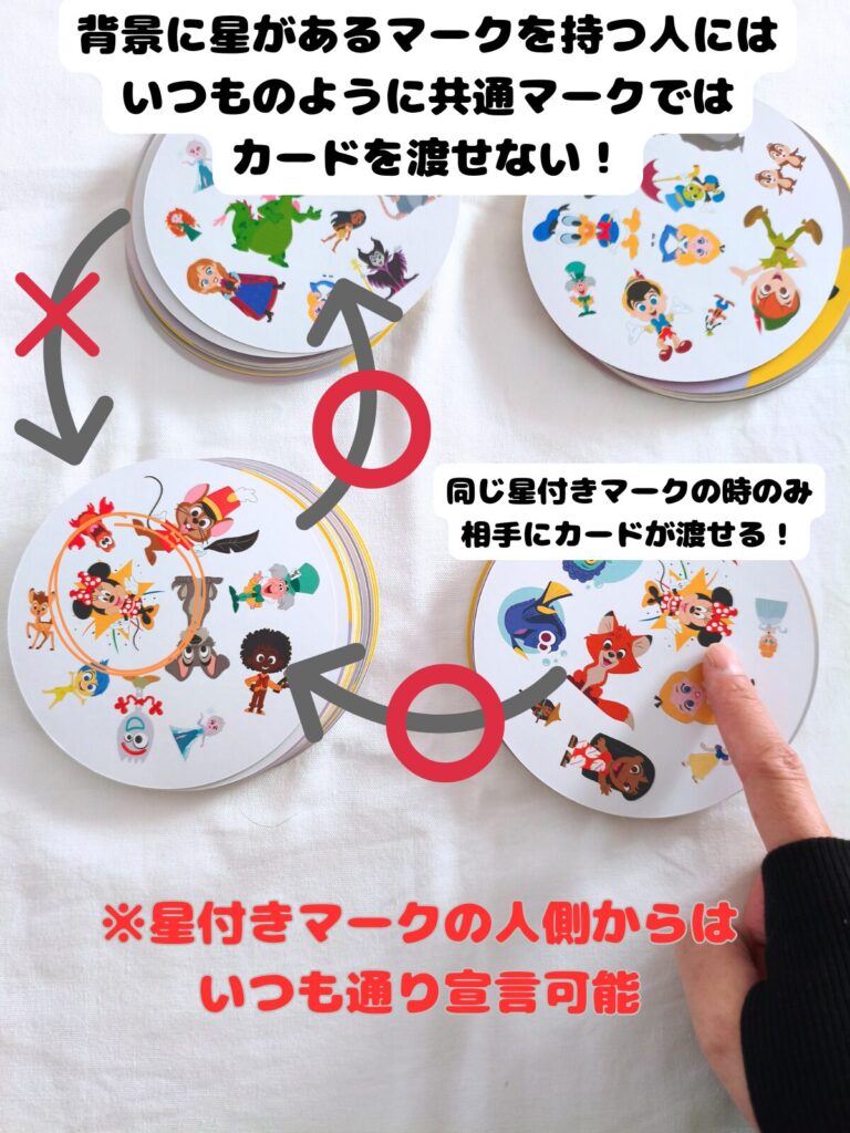 • 自分のカードのミッキーマウスかミニーマウスの後ろに星のマークが隠れていた場合、他の人は同じように星が隠れたマークで、ミッキーはミッキーのみ・ミニーはミニーのみでしか宣言することができない。