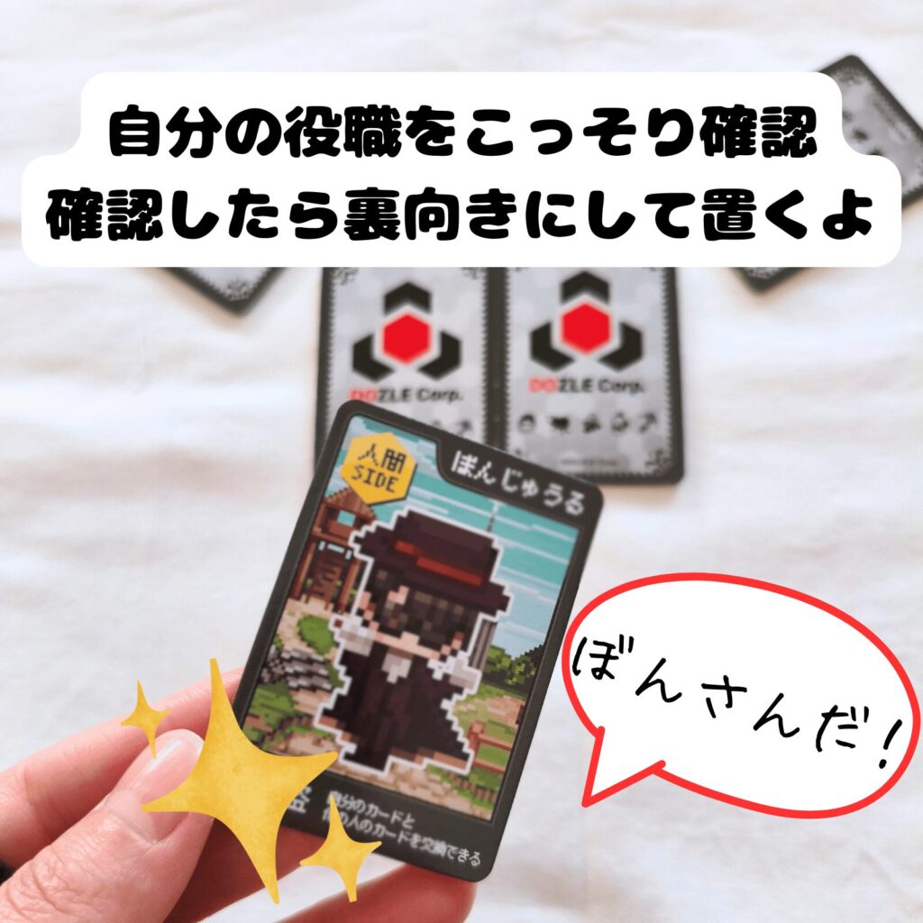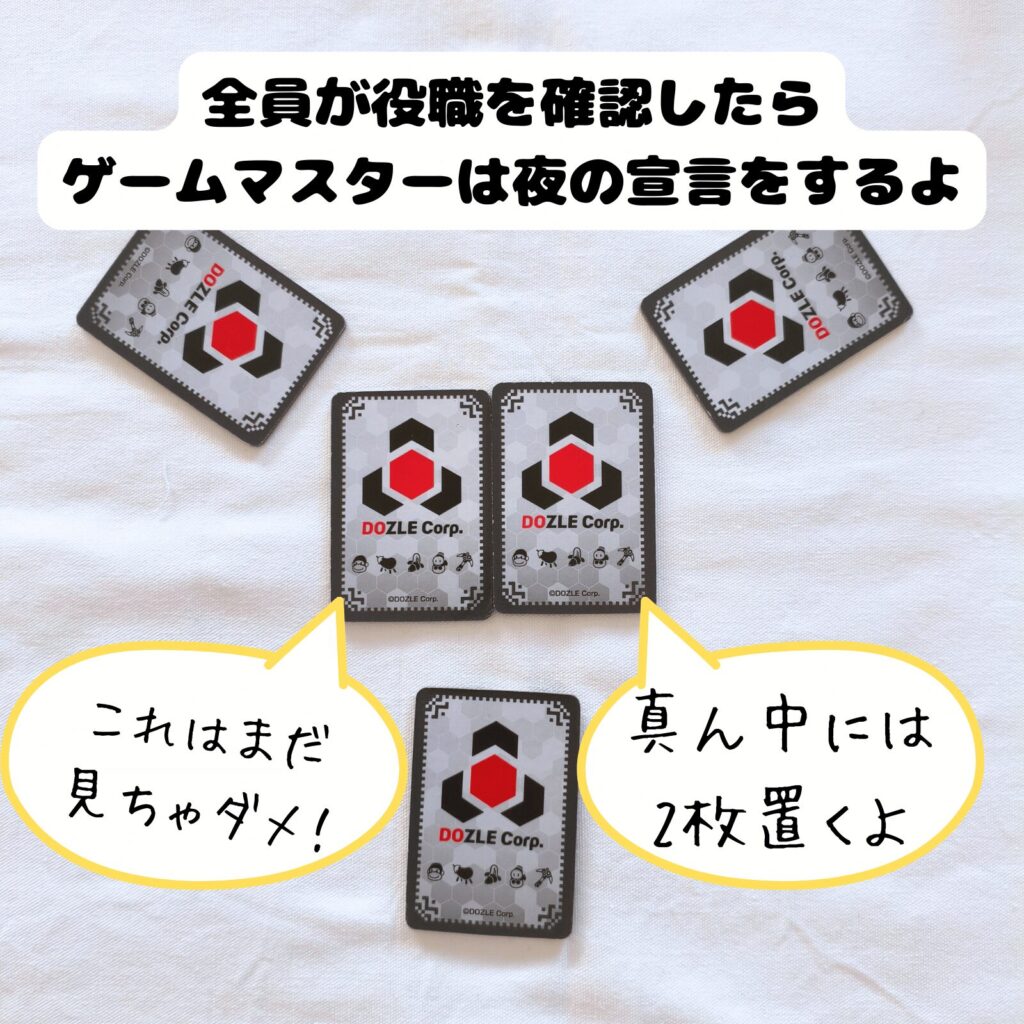 - 自分の役職を確認したら裏向きで中央に出し、選ばれなかった2枚とともにセットする。