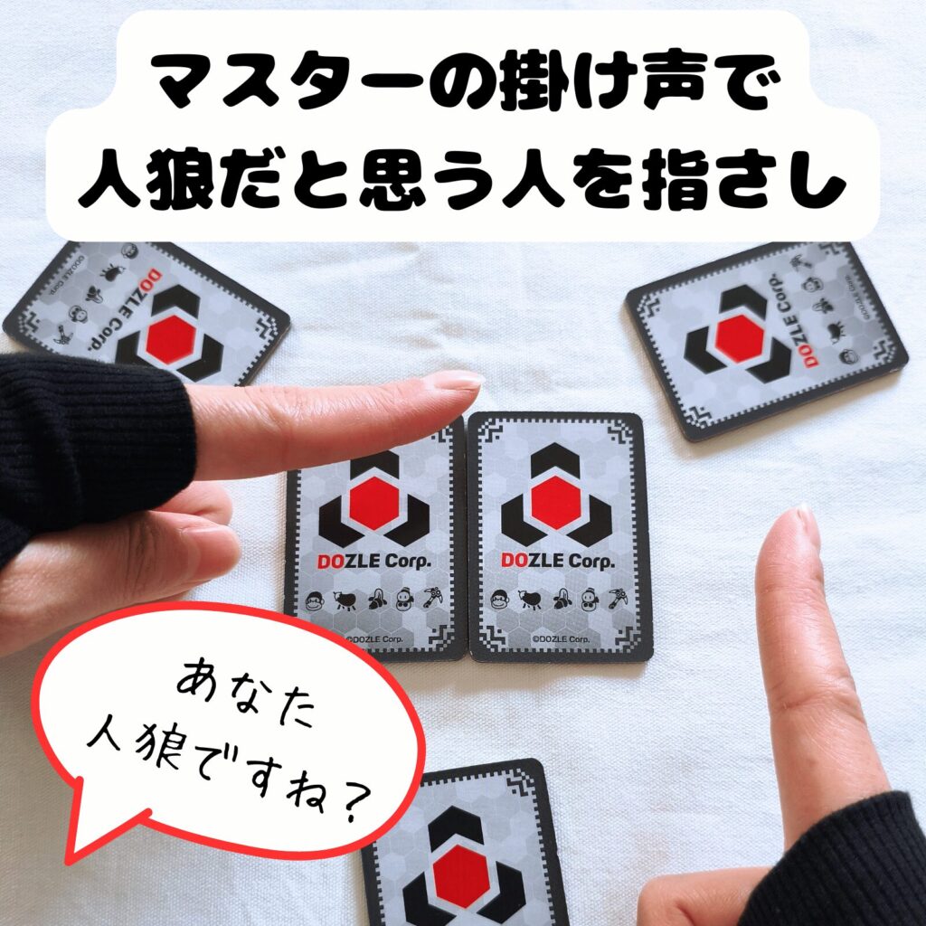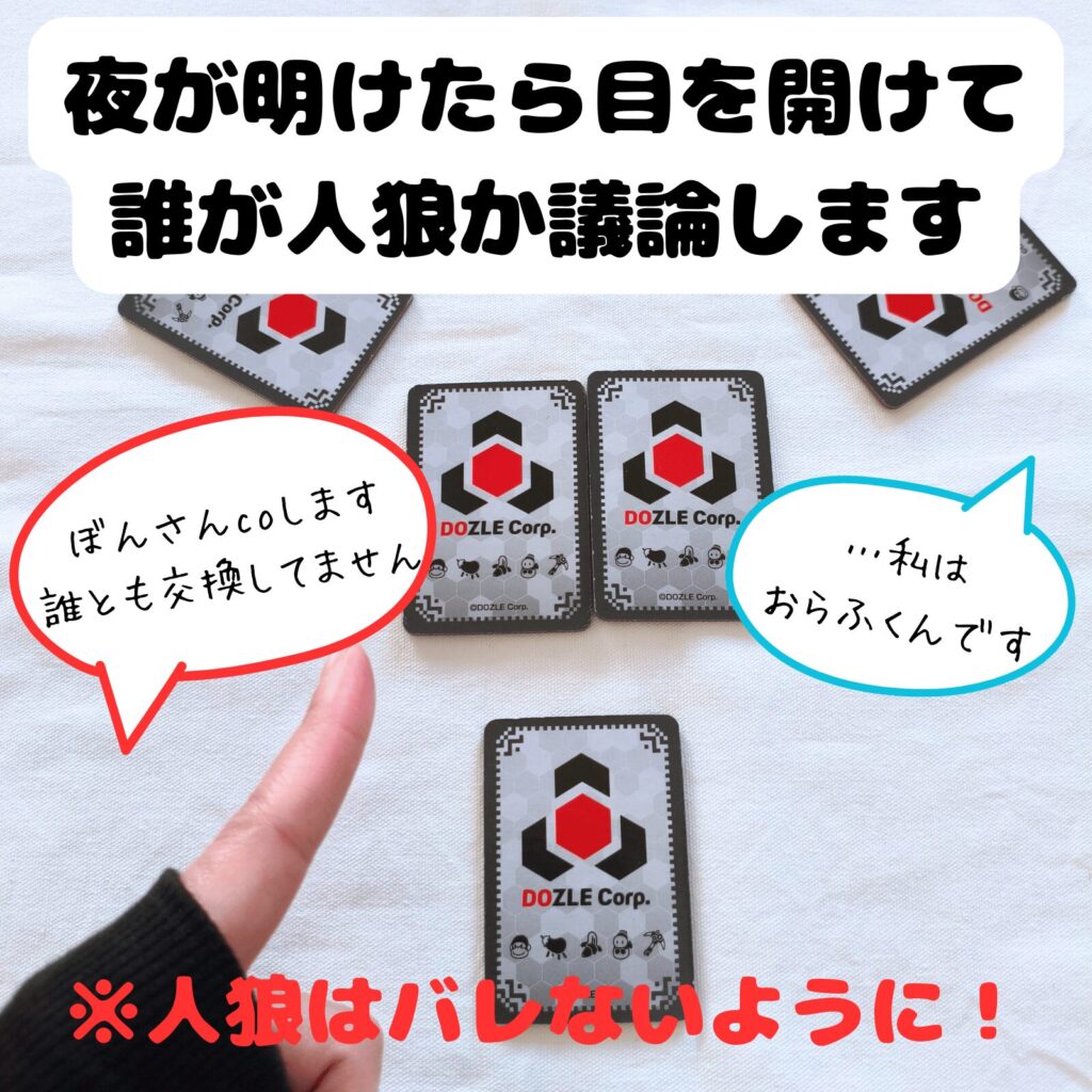 ここで自分の役職を発表したり、誰が人狼か予想したりします。もちろん嘘をつかないと人狼役はバレてしまうので、表情に出さないように気を付けましょう。