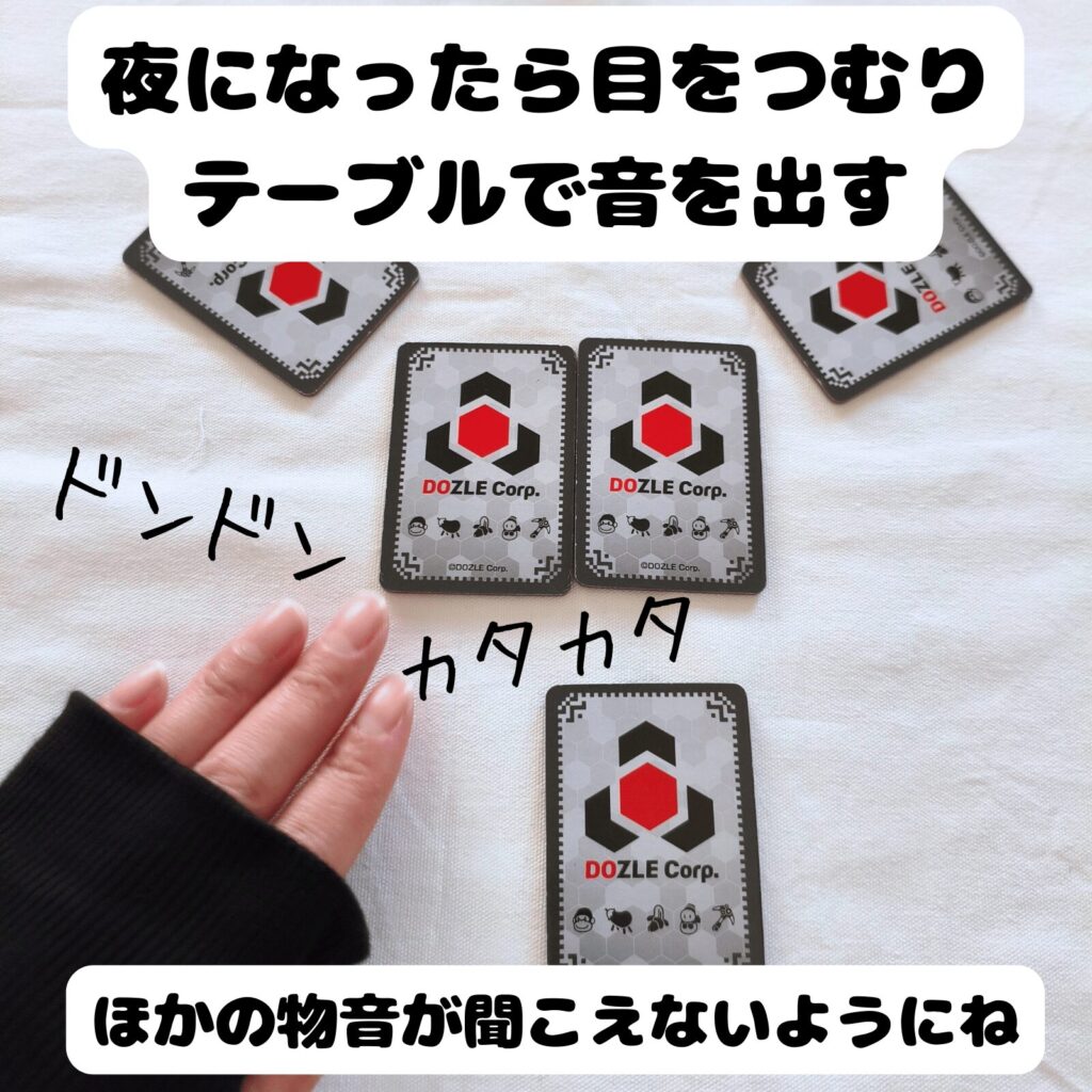 - 全員が目を瞑ったら、テーブルを叩いたり爪を鳴らしたりして音を出す。