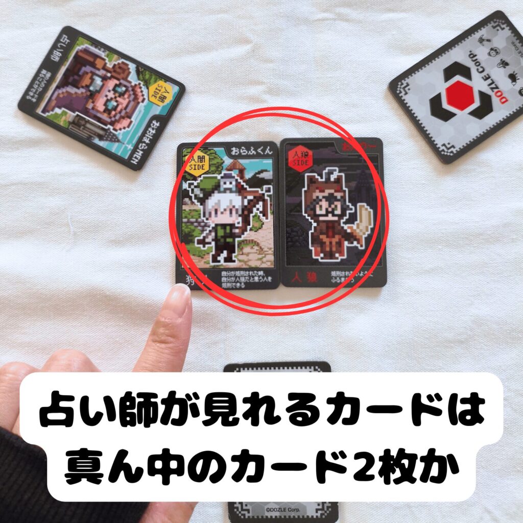 - 占い師だった人は、中央の2枚か誰か1人のカードの表面を確認することができる。