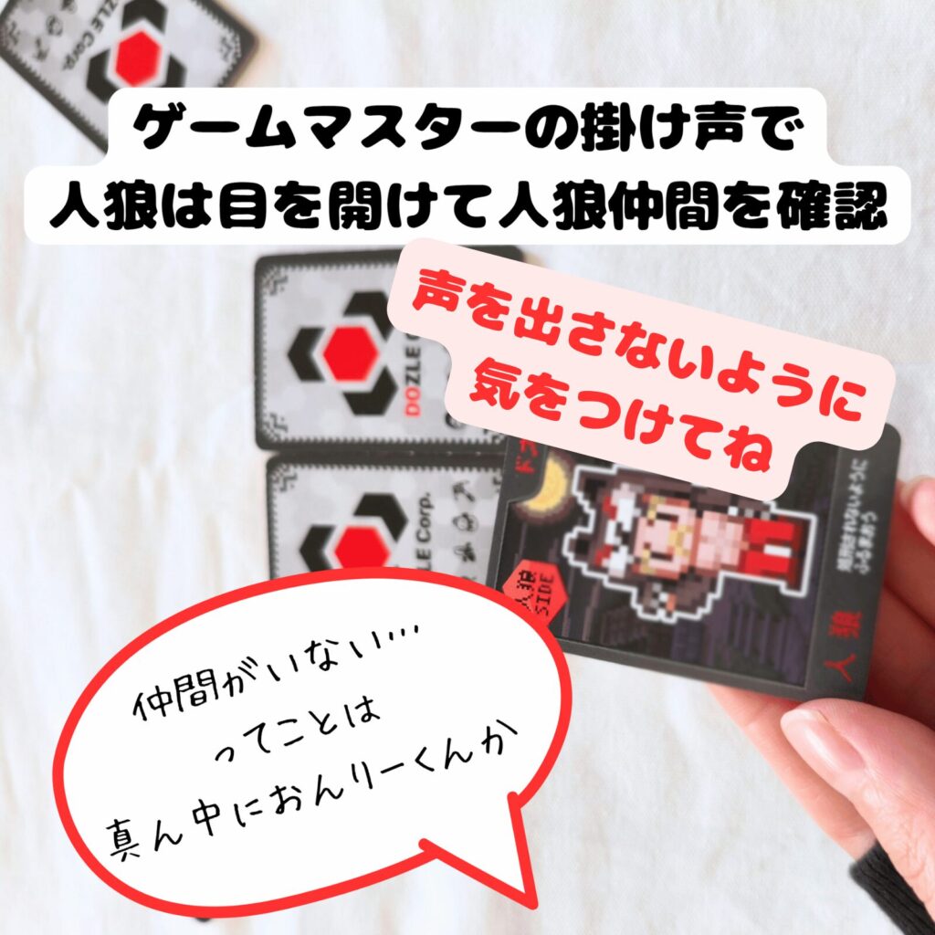 夜の動き方はお子さんには難しいところもあるかと思いますが、ゲームマスターが言葉で『役職とお名前、何をすればいいのか』説明すれば分かりやすいです!