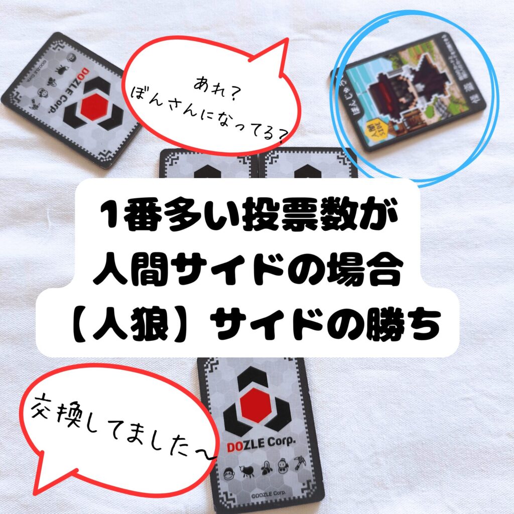 - 得票数が1番多い人が「人間サイド」だった場合、人狼サイドの勝ち。