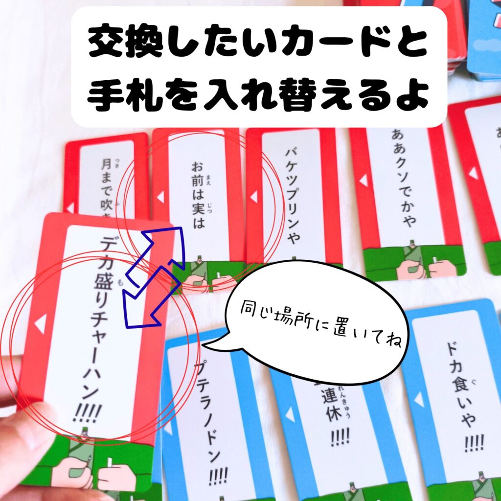 - 手札の中で交換したい1枚を選び、場に出た同じ音のカードと交換する。